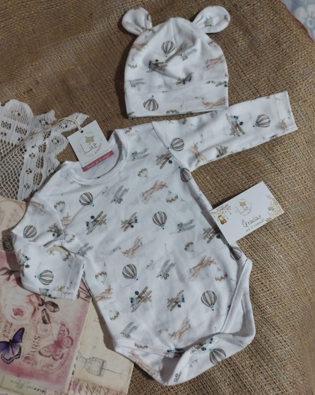 • Body mangas largas con estampa suave de avioncitos y broches metálicos en cuello y zona de pañal