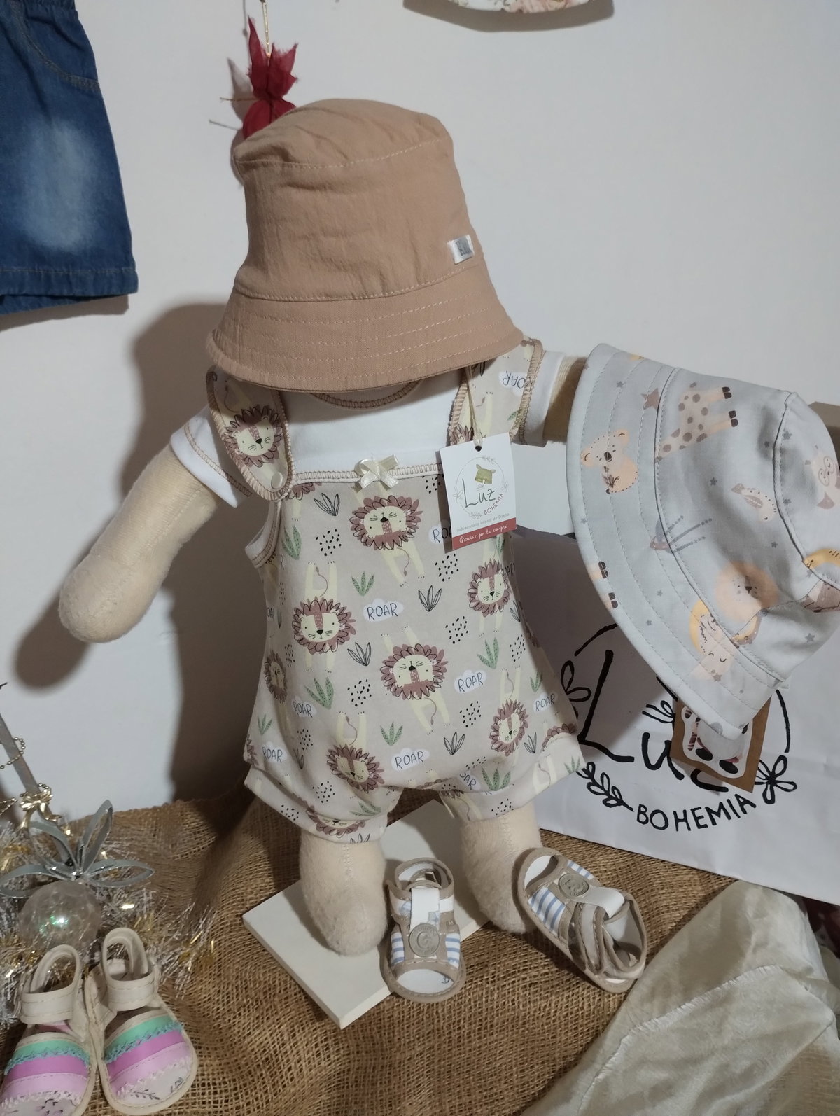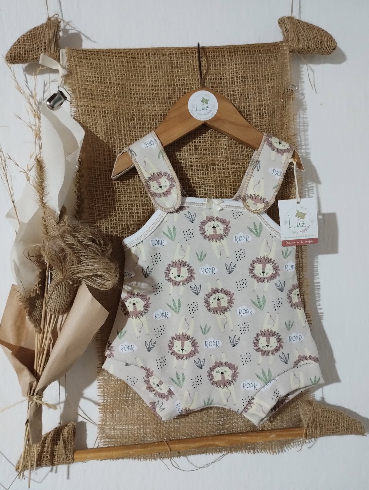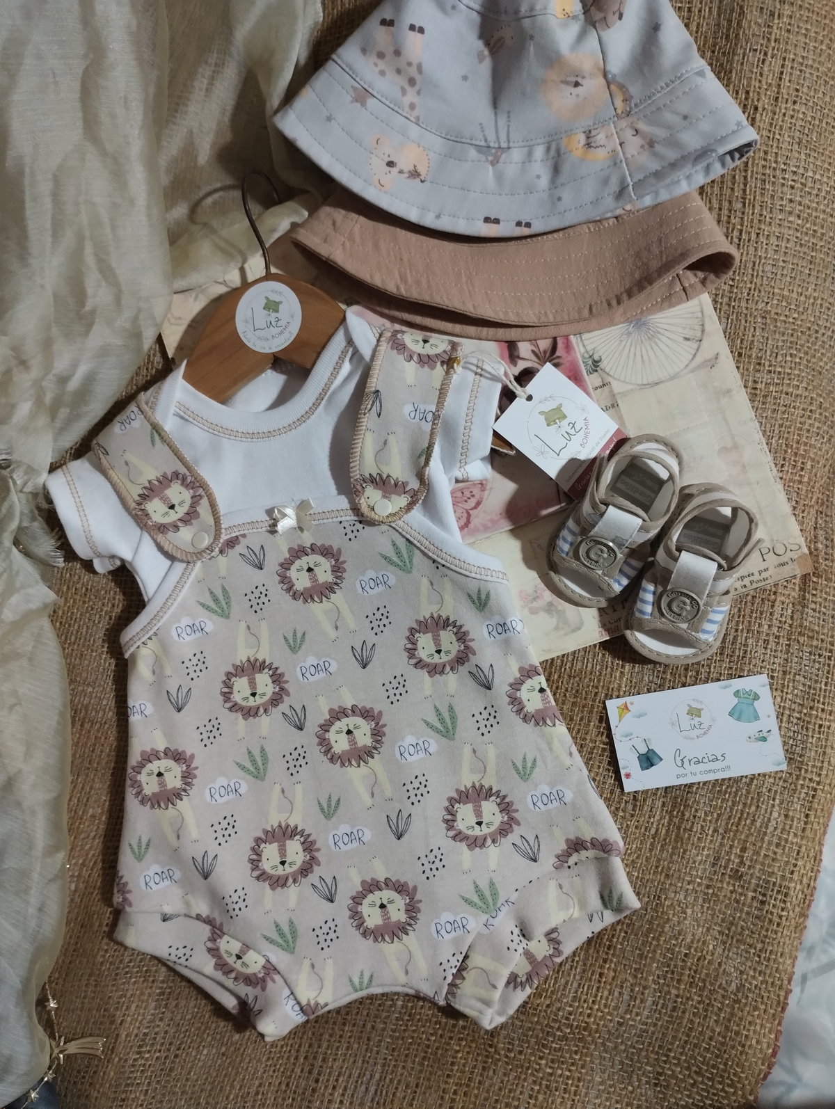 Jardinero corto en algodón con estampado de leoncitos sobre fondo beige en tonos tierra.