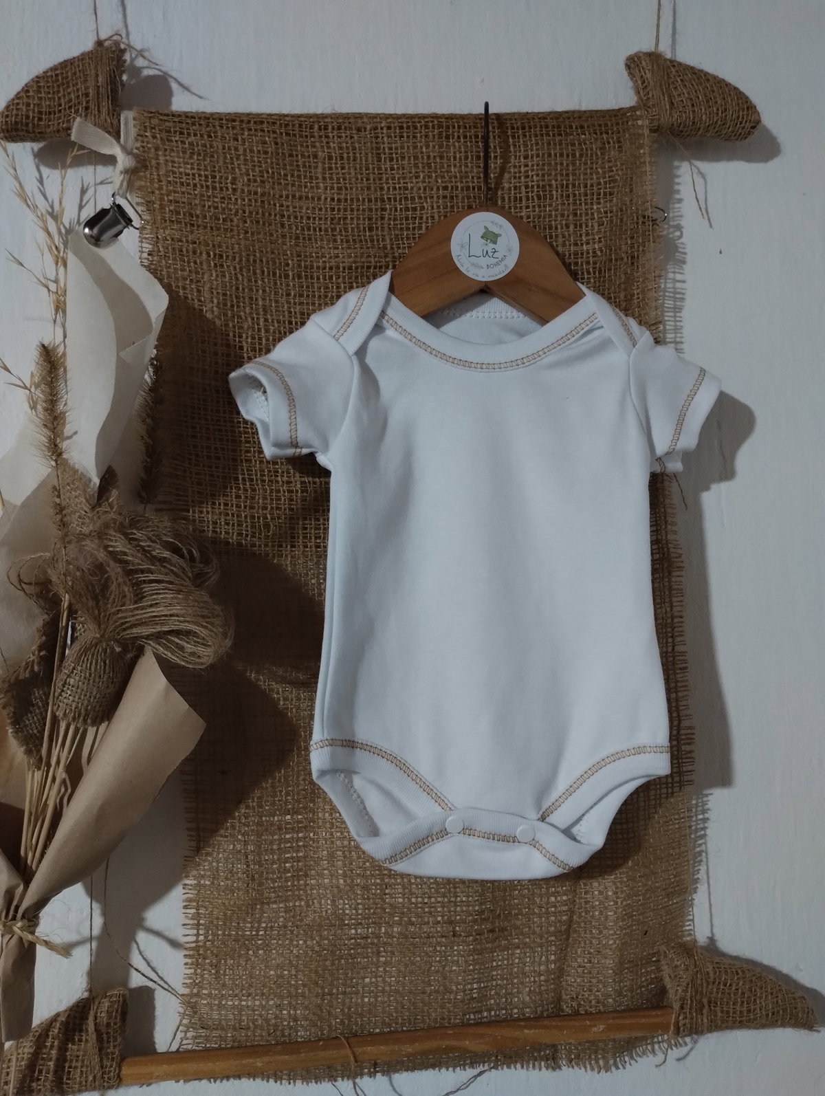 Body en algodón con detalle de costura en marrón tostado, mangas cortas y broches prácticos en la zona del pañal y cuello americano.