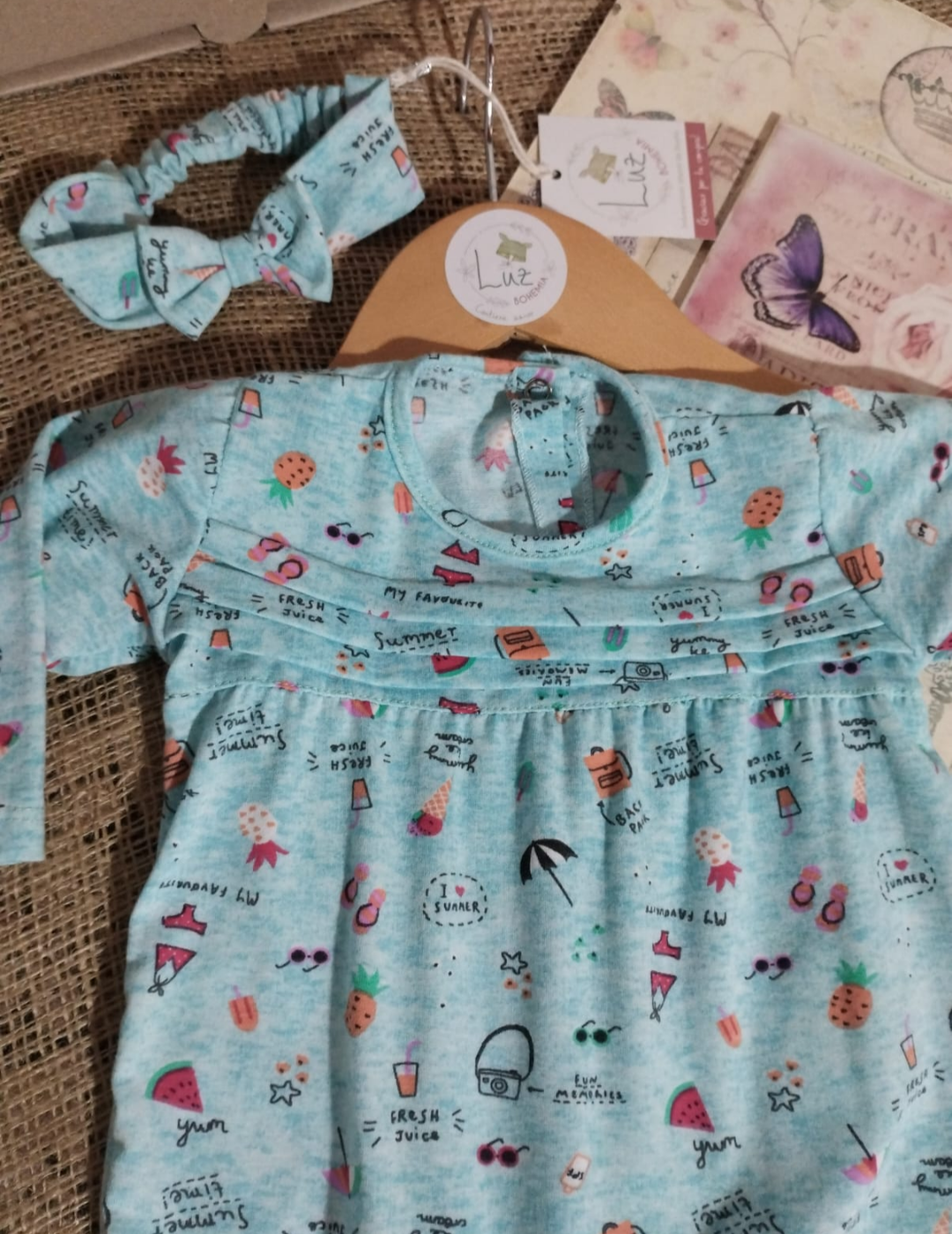 Set de enterito corto para beba, confeccionado en algodón peinado, súper suave y cómodo. Incluye vincha con moño y elástico al tono. Broches en espalda y zona del pañal para mayor practicidad. Último disponible.