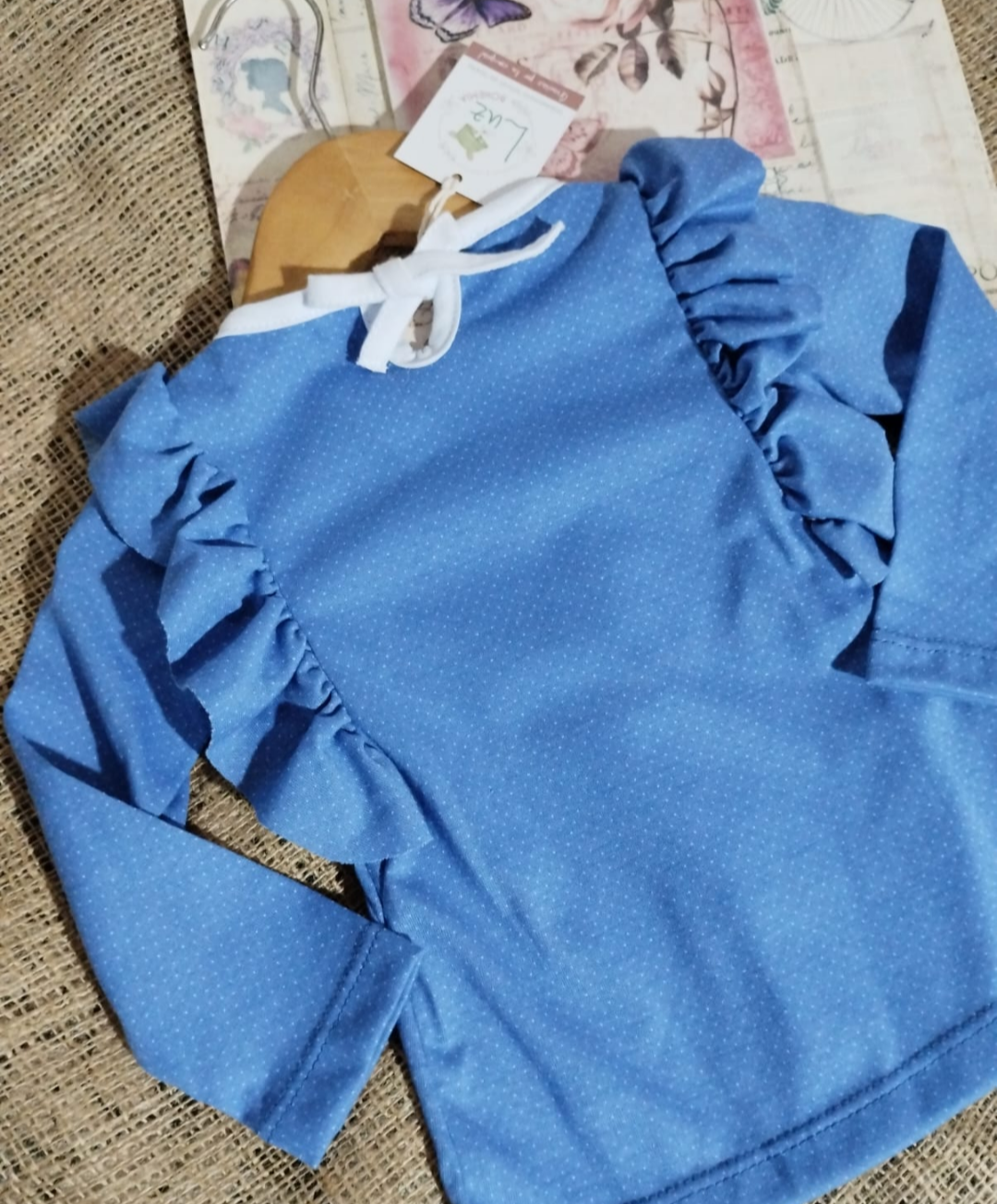 Remera manga larga estilo bobito, en color azul con diminutos lunares blancos.