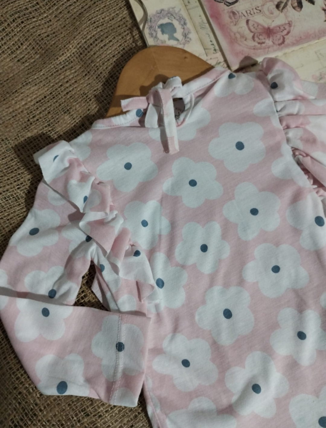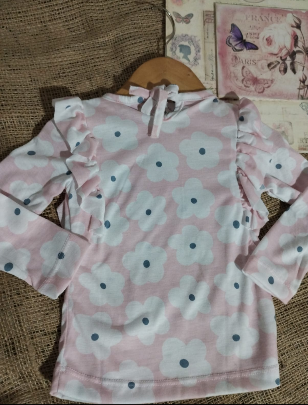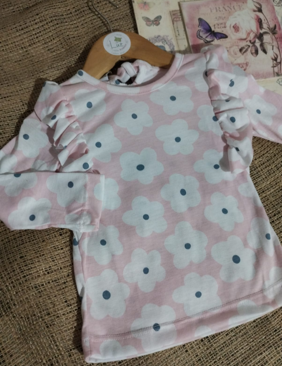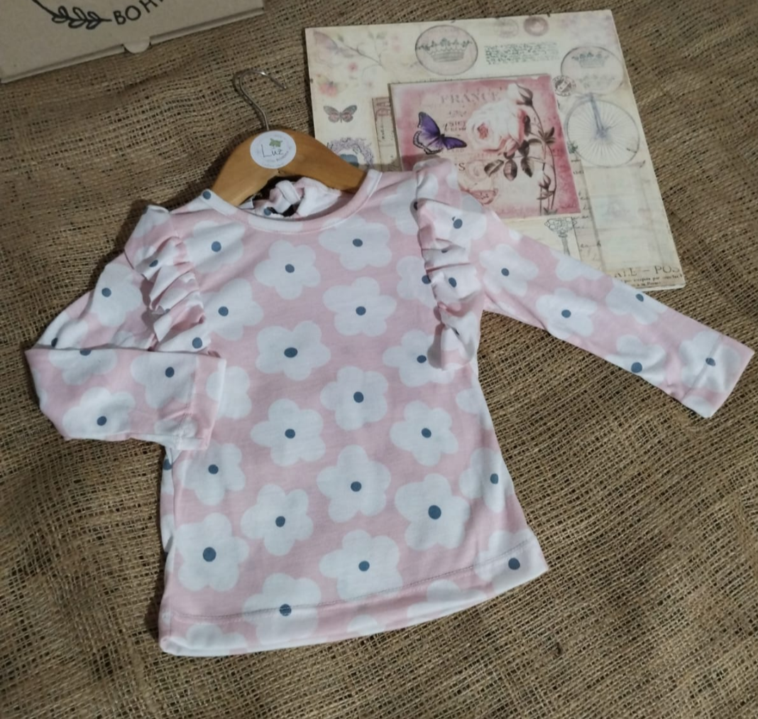 Remera manga larga estilo bobito, en color rosa con flores blancas.