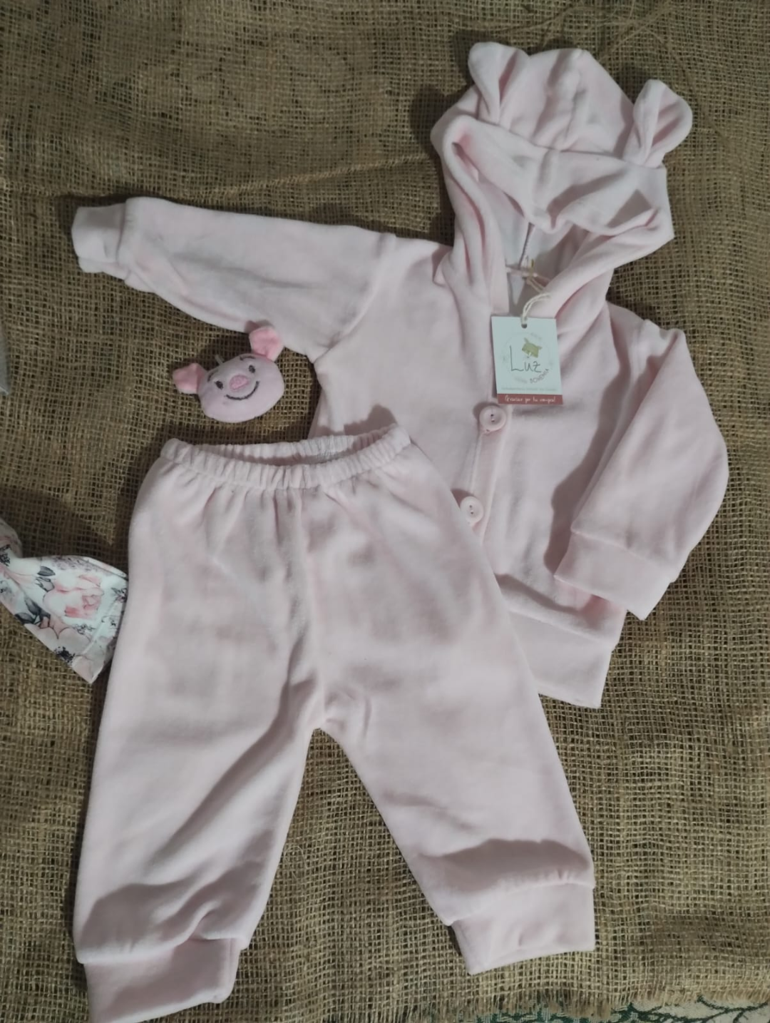 Confeccionado en plush súper suave, este set incluye campera con capucha y orejitas con botones, y pantaloncito sin pie con puño. Ideal para mantener a tu bebé abrigada, cómoda y adorable todo el día.