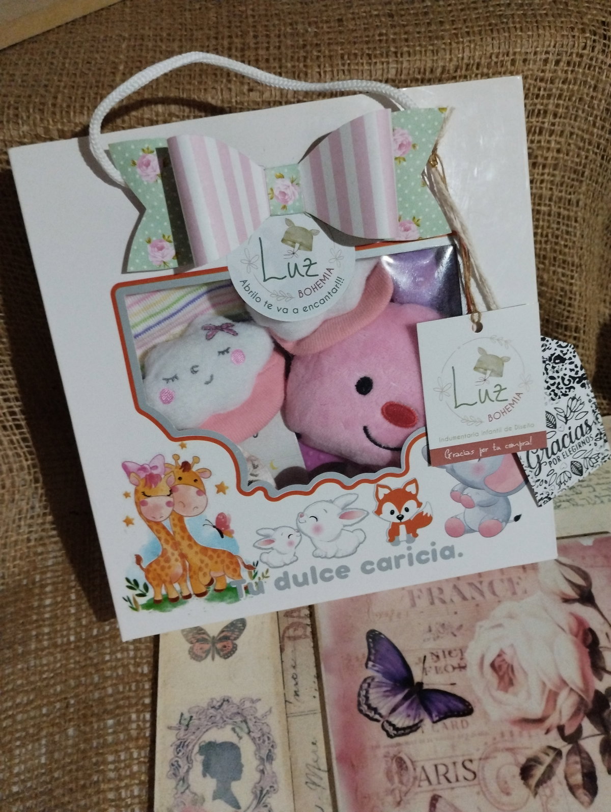 El sonajero modelo conejito con mordillo estimula el agarre y acompaña la etapa de dentición. Las medias con sonajero suman diversión y seguridad gracias a su base antideslizante, y el portachupetes completa el conjunto con practicidad.