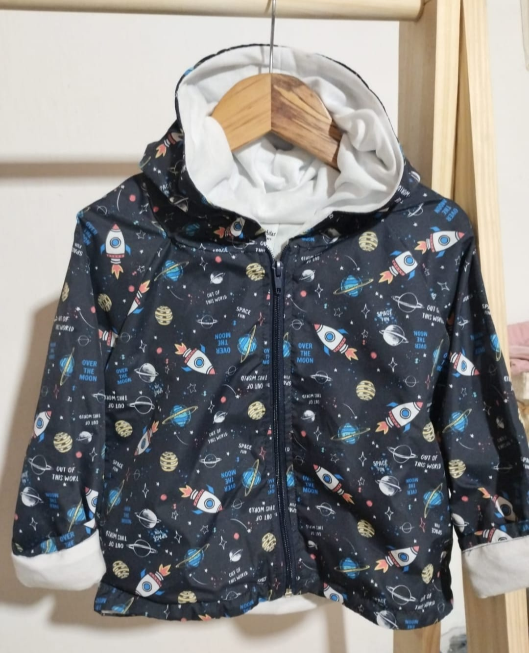 Color: Fondo azul con estampa espacial (cohetes y planetas)