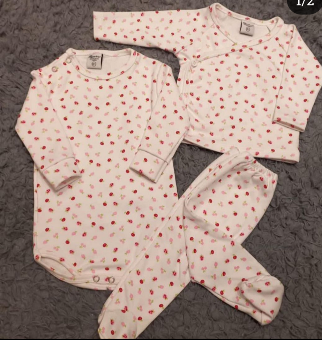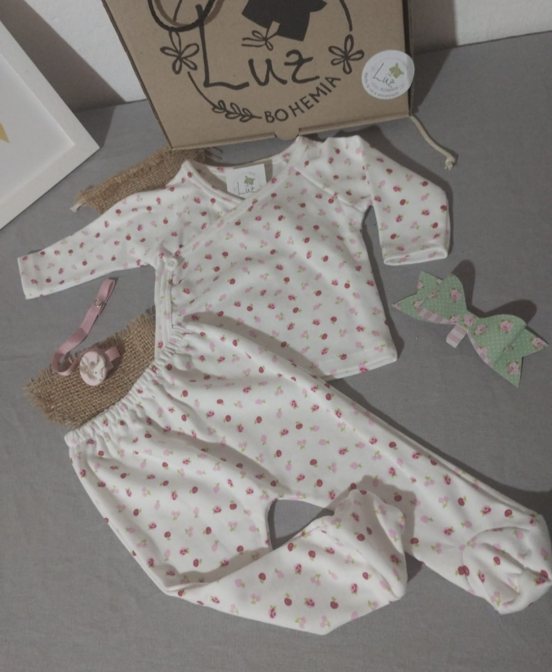 El ajuar de nacimiento Guadalupe es un set delicado y femenino, con estampa inspirada en el cerezo sobre fondo blanco 🤍