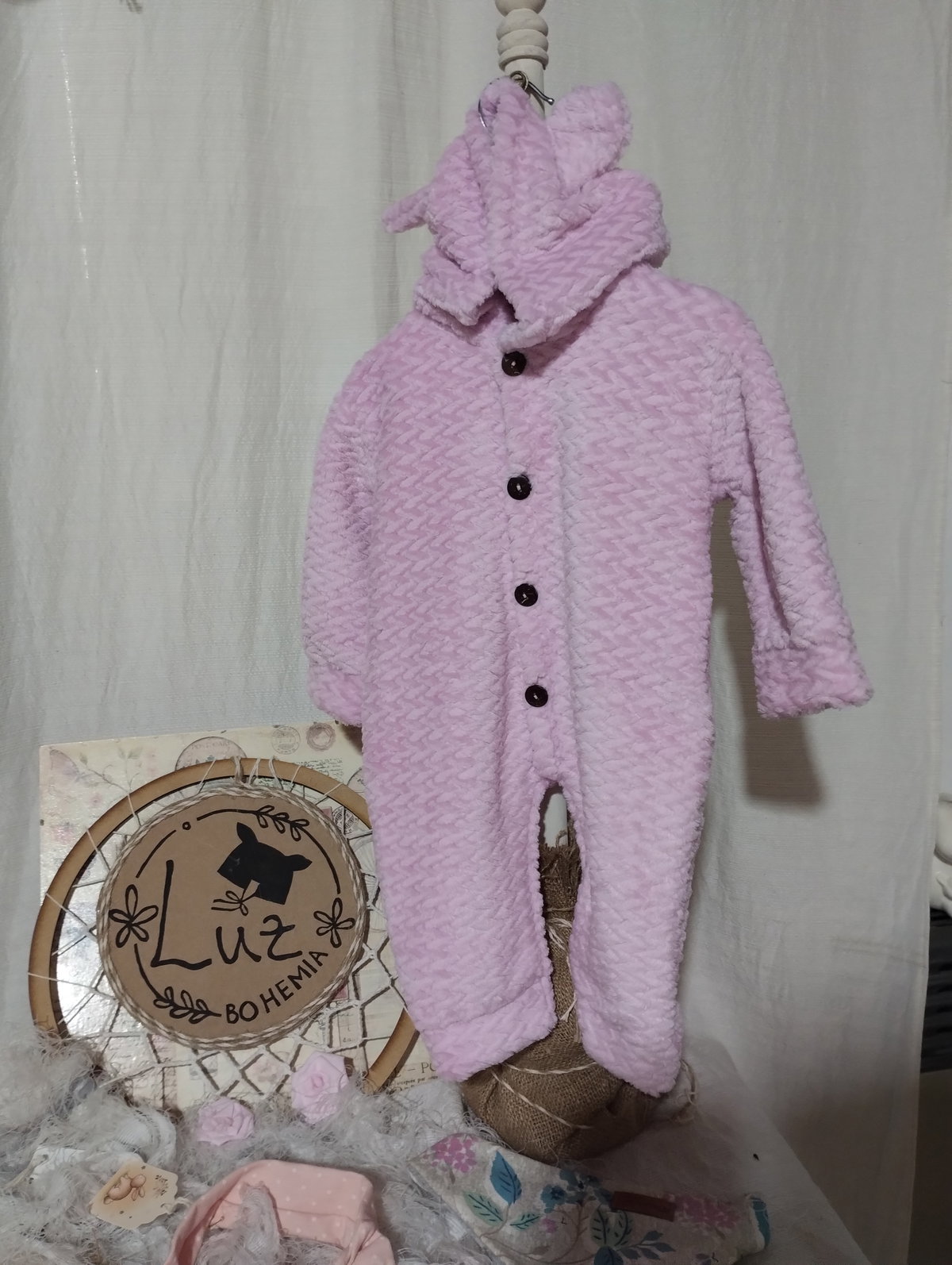Enterito abrigo confeccionado en piel de corderito extra suave con textura drapeada, terminación sin pie y botones de madera. Capucha con orejitas que le da un toque de ternura irresistible. Abriga sin sofocar, ideal para mantener a tu bebé cómodo y protegido.