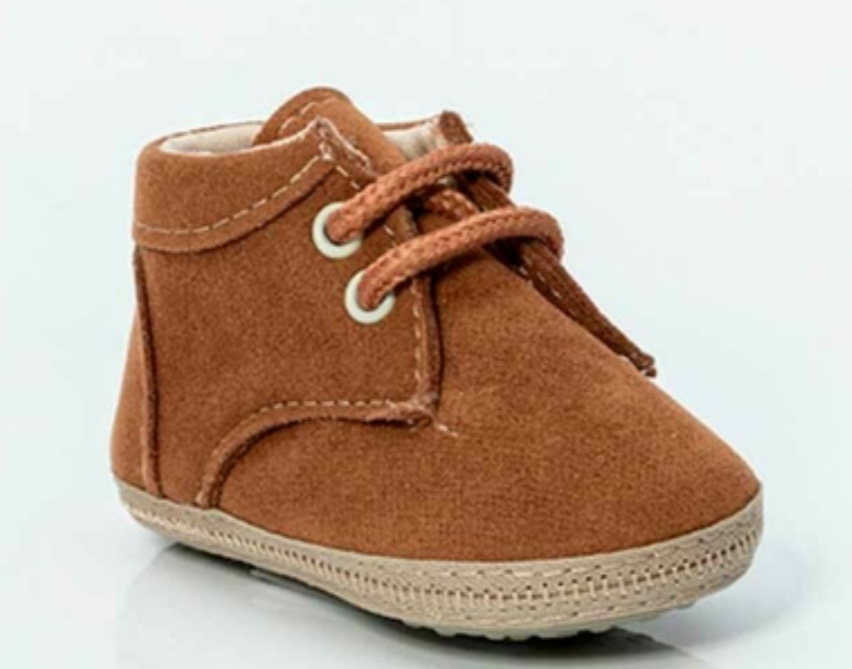 Botita para bebé confeccionada en tela de gamuza, suave y flexible, ideal para acompañar los primeros movimientos 🤍