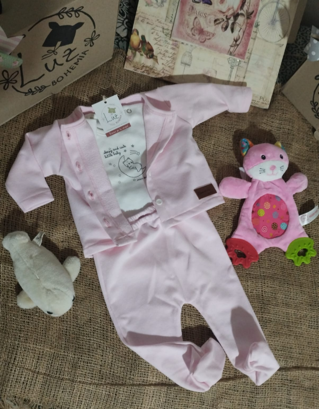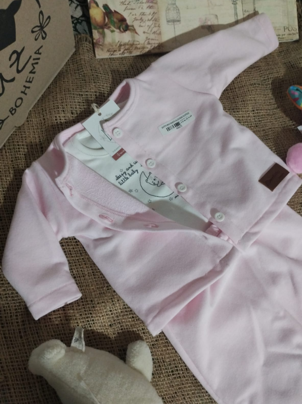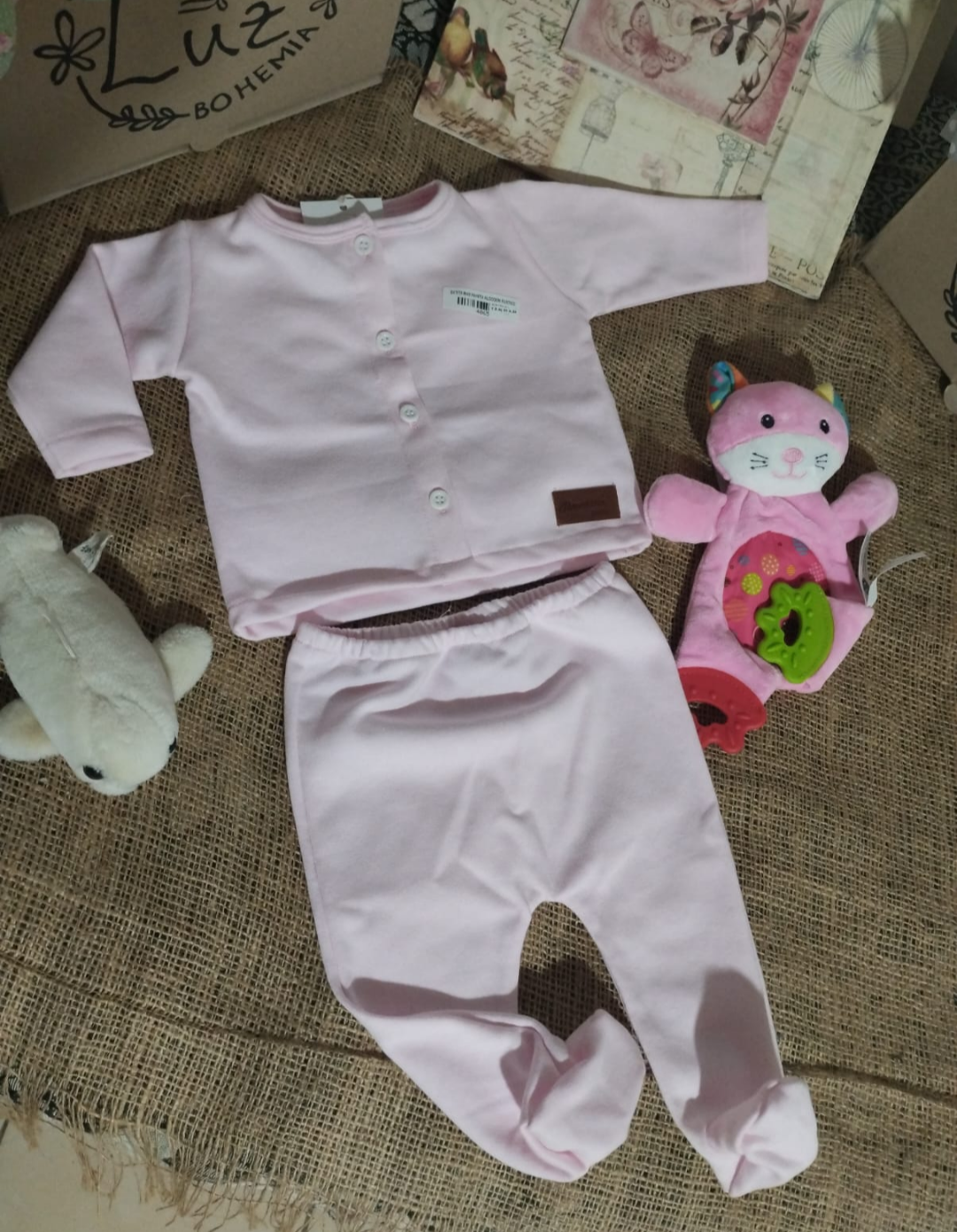 Confeccionado en algodón rústico, ofrece suavidad, confort y practicidad para los primeros meses del bebé. Su delicado tono rosa bebé transmite ternura, mientras que el detalle de la etiqueta aporta un toque moderno y encantador.
