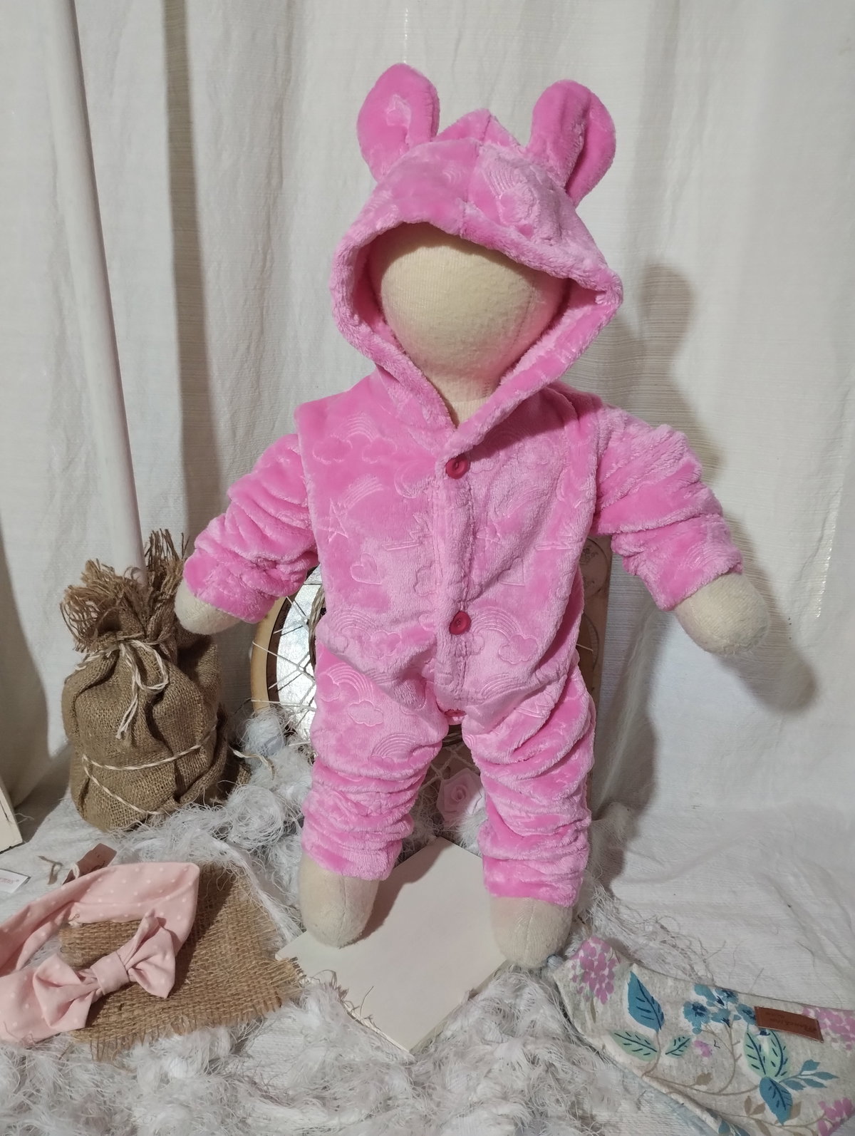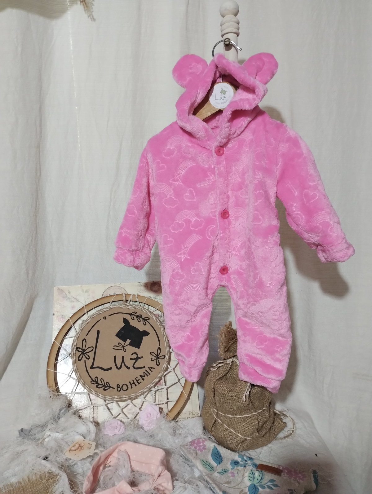 Enterito abrigo confeccionado en polar extra suave con textura de dibujos, terminación sin pie y botones. Capucha con orejitas que le da un toque de ternura irresistible. Abriga sin sofocar, ideal para mantener a tu bebé cómodo y protegido.