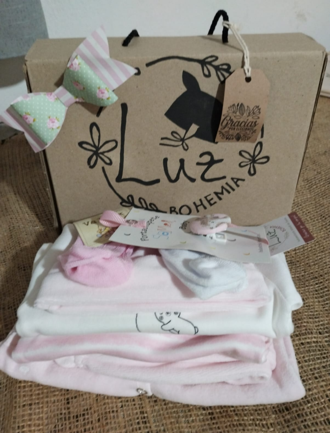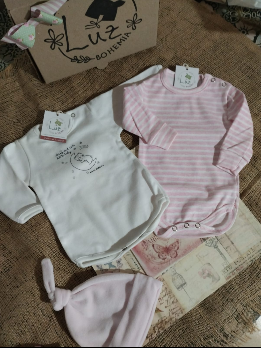 Este delicado box incluye 8 piezas esenciales para los primeros días: