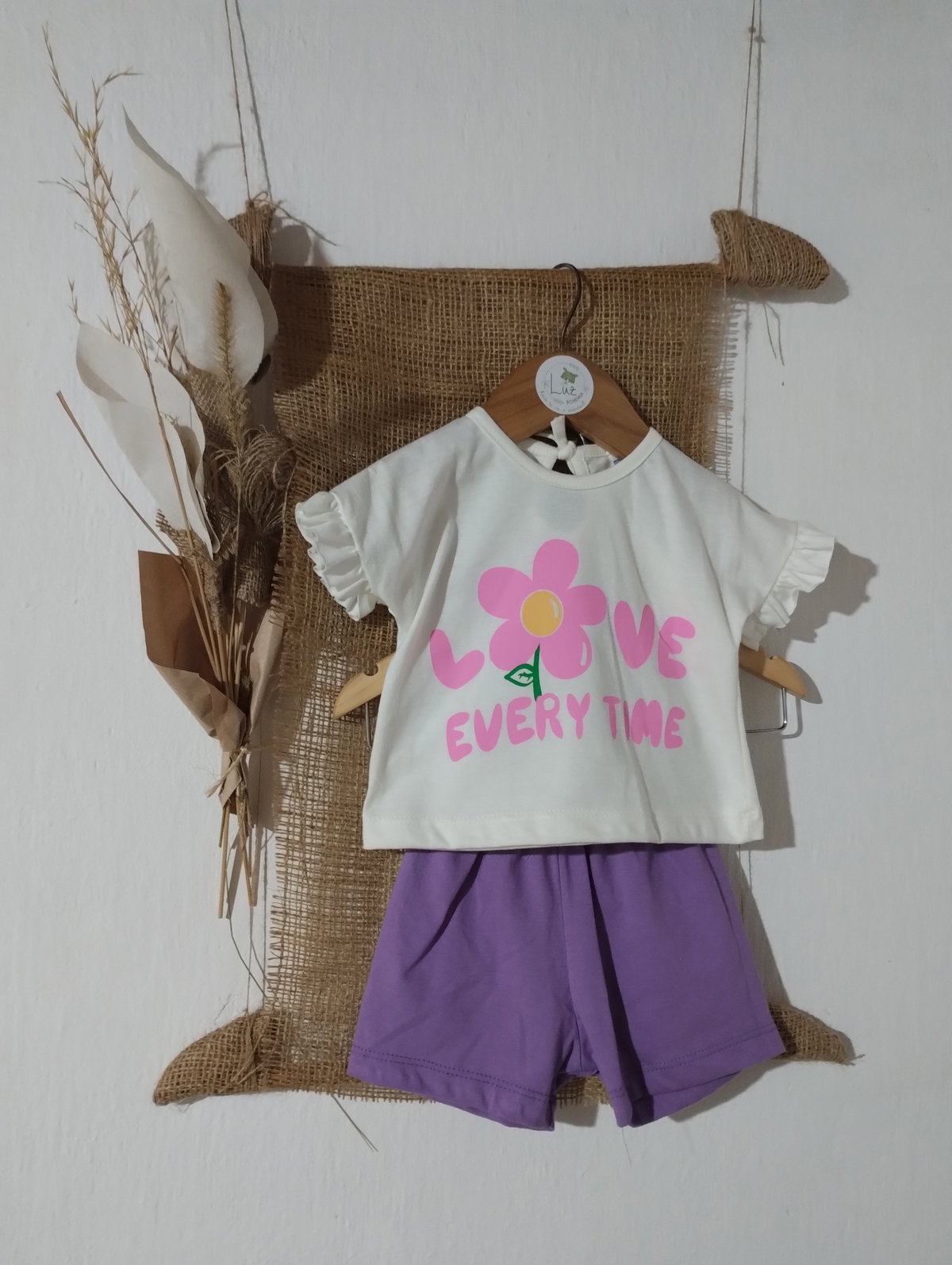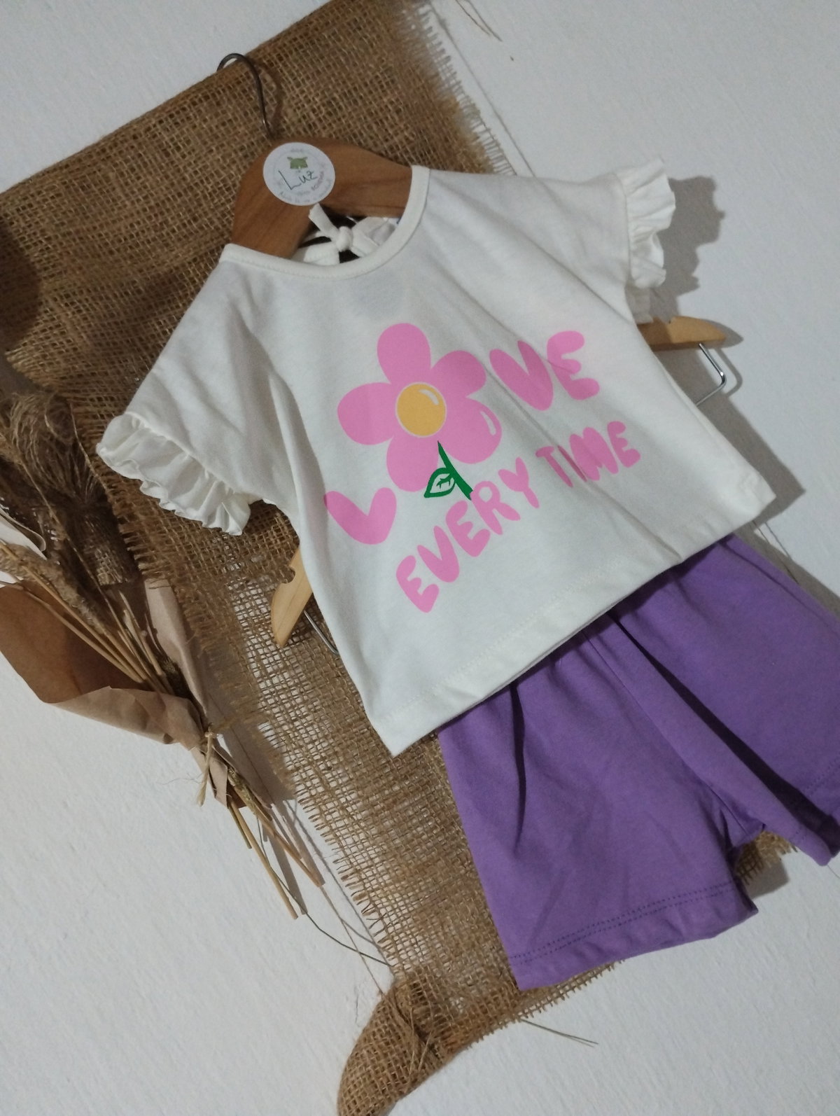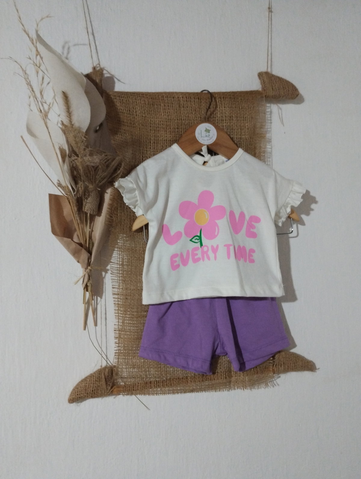 Confeccionado en algodón suave, este conjunto de dos piezas combina la remera con volados y detalle de prendidura en la espalda, con un short práctico y colorido. La estampa “Love Every Time” le da un toque tierno y divertido, ideal para todos los días.