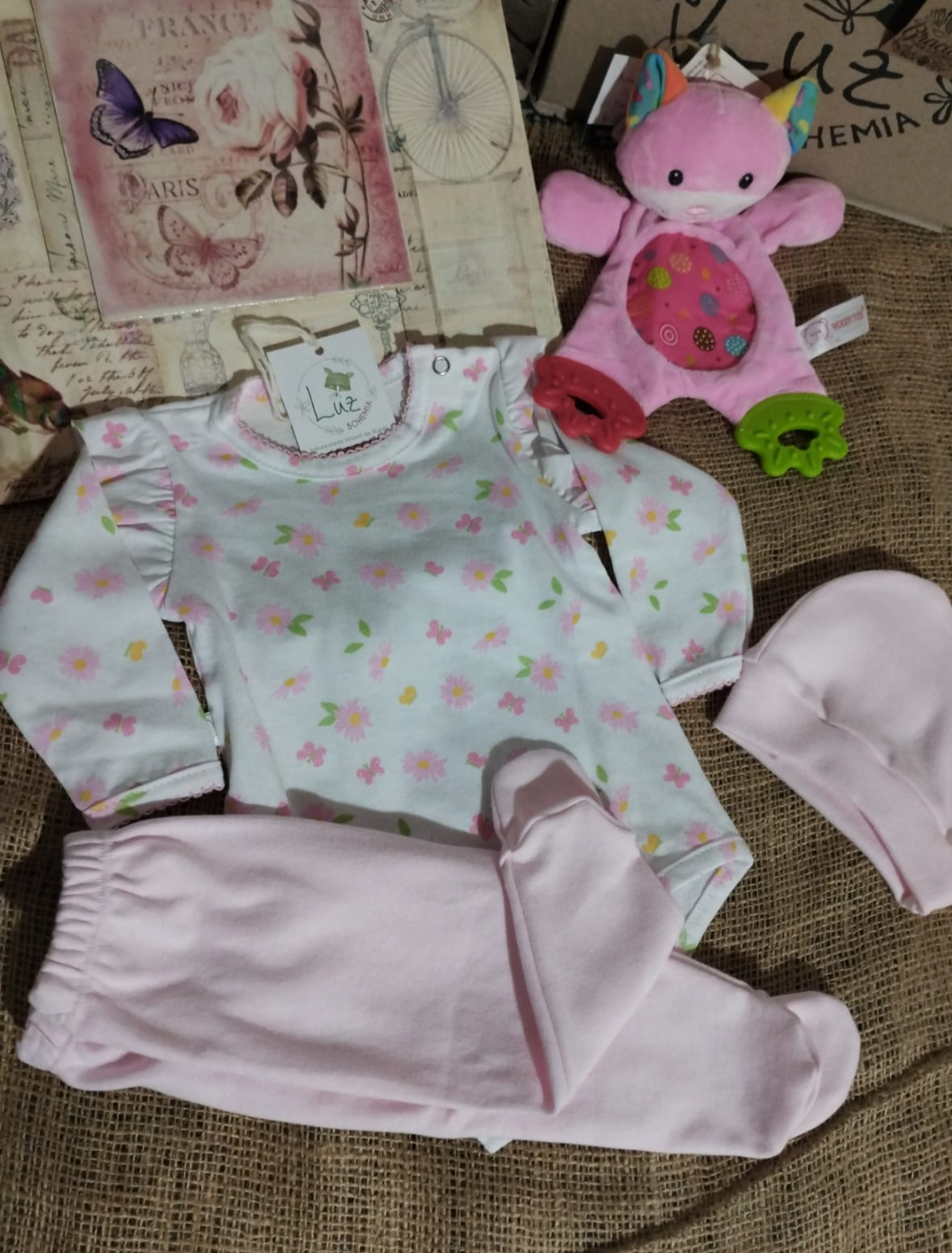 Sus tonos rosa pastel y su estampa floral delicada lo convierten en una opción romántica y elegante para los primeros meses.