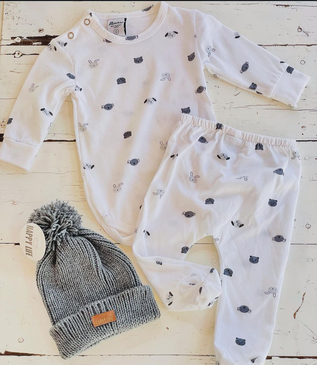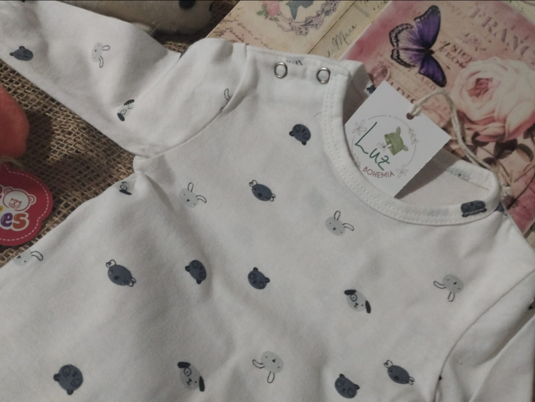 Confeccionado en algodón peinado, ofrece una textura más suave, resistente y delicada al tacto. Su estampa de perritos grises sobre fondo blanco lo convierte en un diseño clásico, elegante y atemporal.