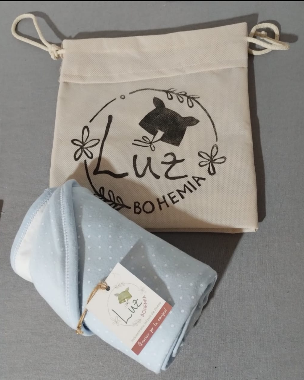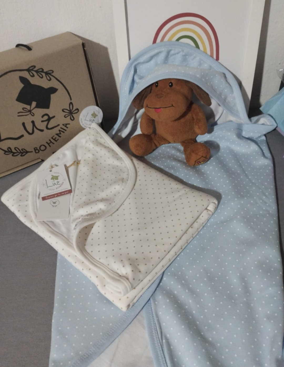 Una capa interior blanca con capucha, y capa exterior estampada en fondo liso con pequeños lunares blancos, ideal para abrazos y momentos de descanso.