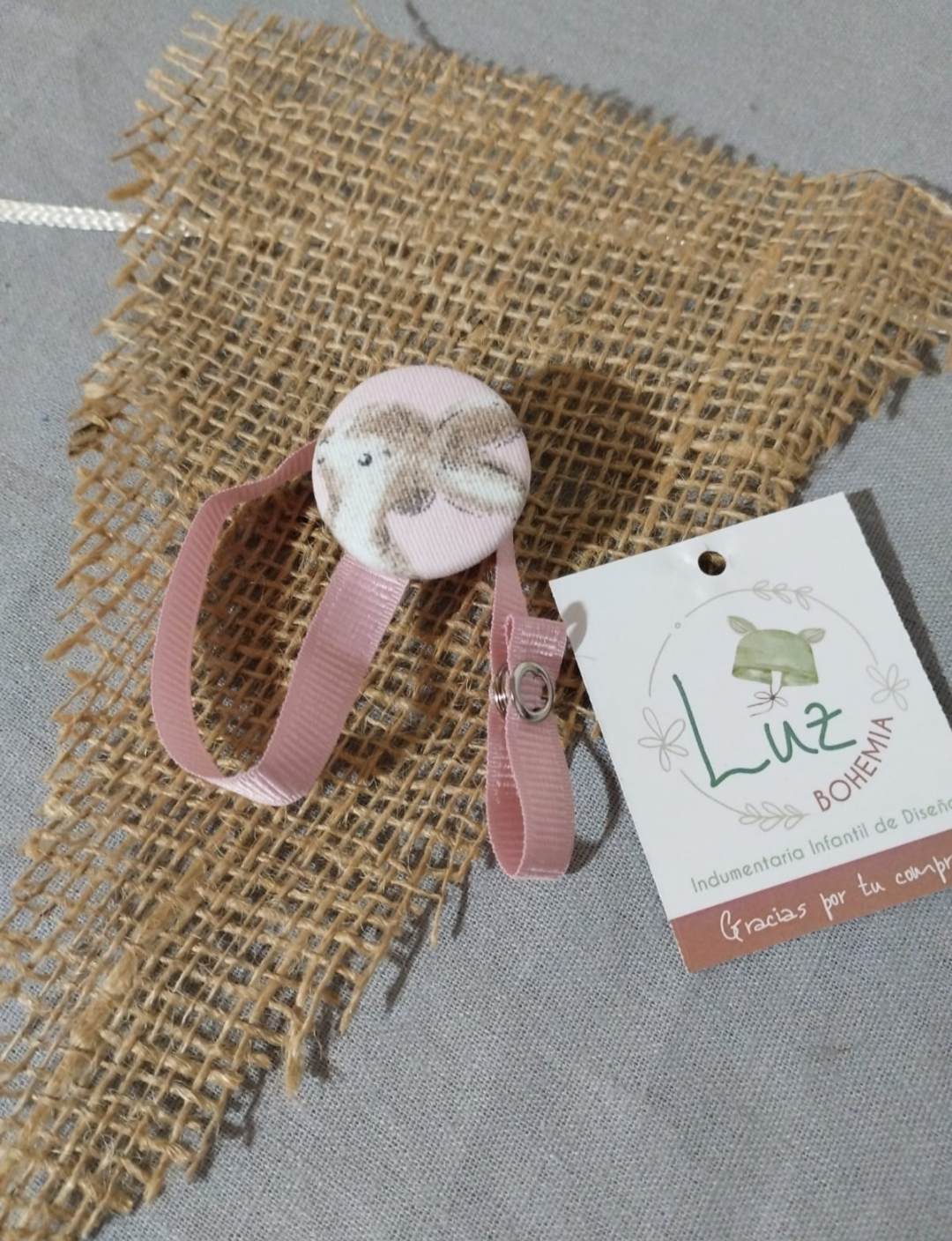 El portachupetes botón es práctico, delicado y perfecto para mantener el chupete siempre a mano y seguro.